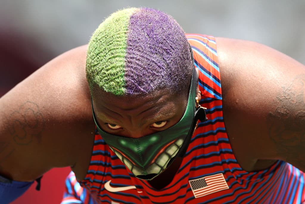 La atleta estadounidense se ha vuelto una figura en redes sociales por construir un personaje alrededor de ella: cabello pintado de verde y morado, haciendo referencia a Hulk, así como un cubrebocas con la figura del superhéroe de Marvel.