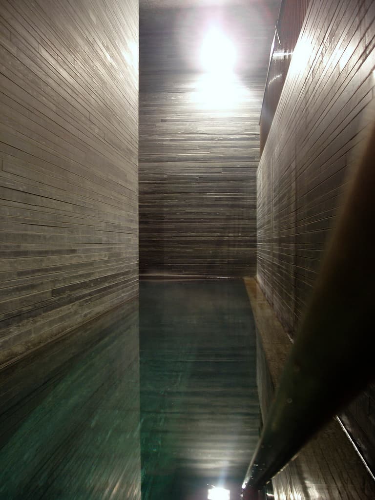 Ubicado a unos 200km de Zurich, en Vals, este edificio se parece a un bunker de piedra exteriormente, mientras que por dentro parecería asemejarse al interior de la tierra, dado que se recrea un ambiente cálido, con una luz azul y mucha agua que se une a ese ambiente irreal. Todo ello combinado con una incomparable vista del valle suizo que es el deleite de miles de turistas que optan por pasar allí sus relajadas vacaciones.