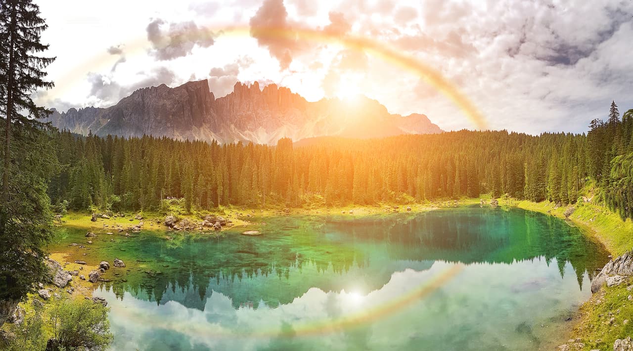 El reflejo en este lago de Tentino, Italia, hizo que el arco colorido se transformara en un círculo.
