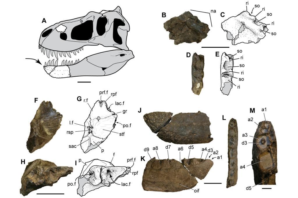Aunque las piezas fósiles encontradas son solamente tres partes incompletas del cráneo de un ejemplar (un fragmento de la cara, uno del maxilar y otro de la parte superior del cráneo), esto ha sido suficiente para que los experimentados paleontólogos del Museo Perot de Naturaleza y Ciencia de Dallas, en el estado norteamericano de Texas, determinaran que se trataba de una nueva especie para la ciencia, y más aún, de un tiranosaurio.