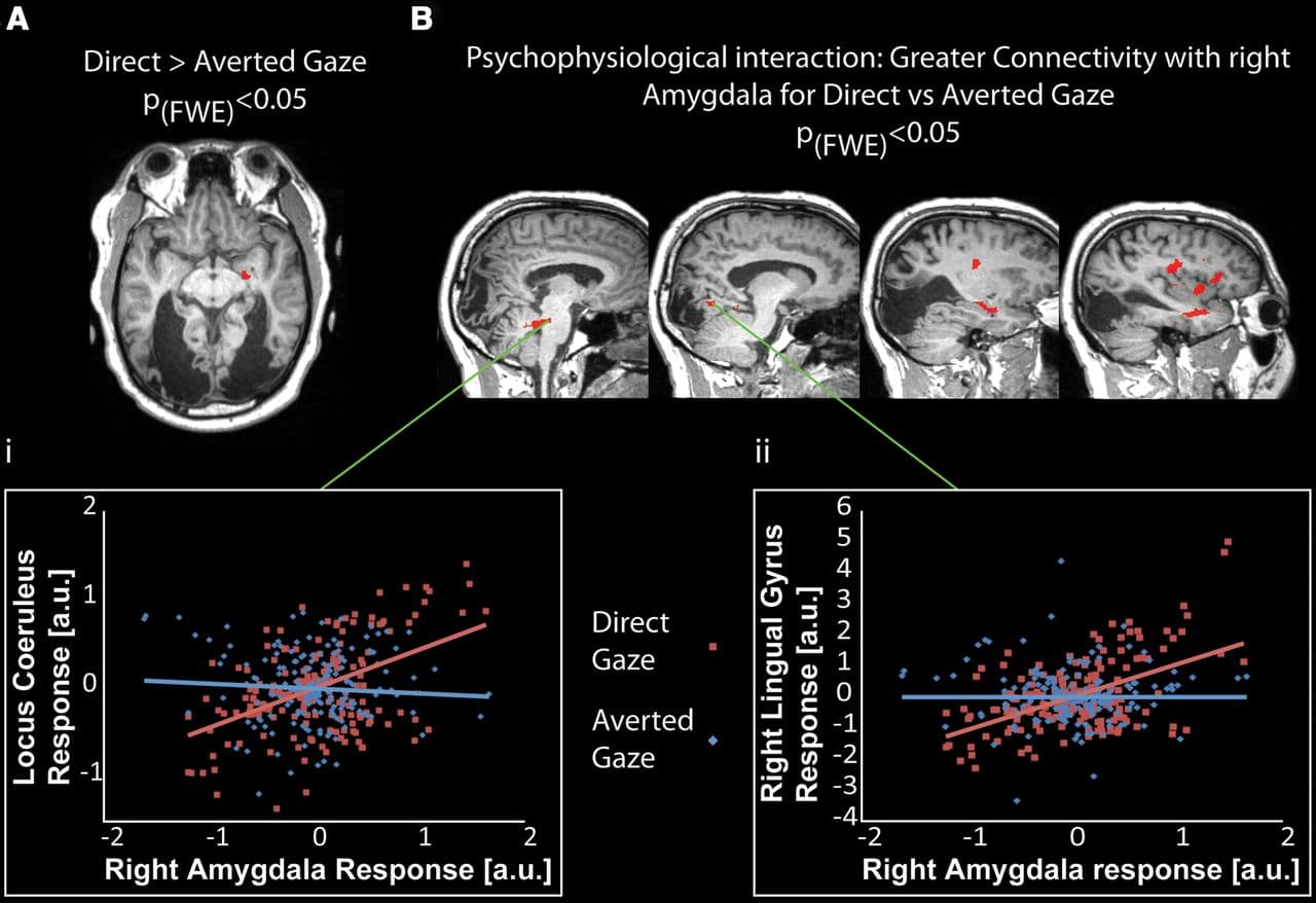 La imagen derecha muestra la respuesta de la amígdala cerebral ante las miradas directas (rojo) y las miradas no directas (azul).