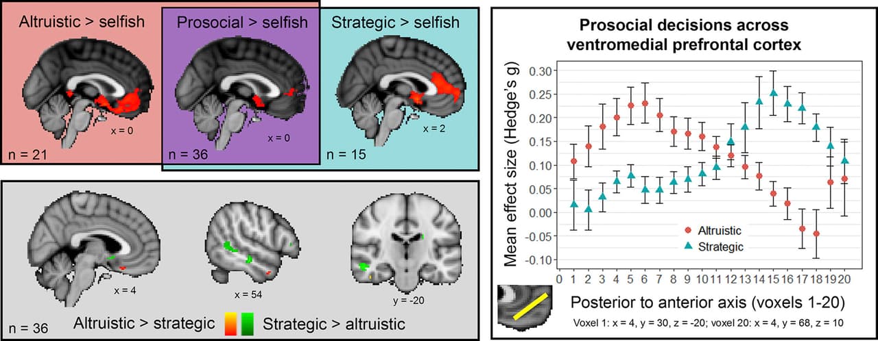 Las acciones altruistas estimulan la corteza cingulada anterior subgenual activada (sgACC). La corteza prefrontal ventromedial (vmPFC) participa de manera consistente durante las decisiones generosas y el procesamiento a través de un eje posterior diferencia el contexto altruista del estratégico. El vmPFC posterior se utilizó preferentemente durante las decisiones altruistas. Las regiones del "cerebro social" mostraron distintos patrones de actividad entre los tipos de elección.