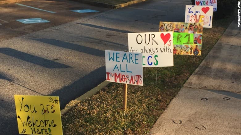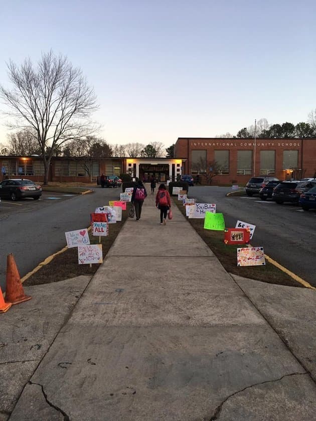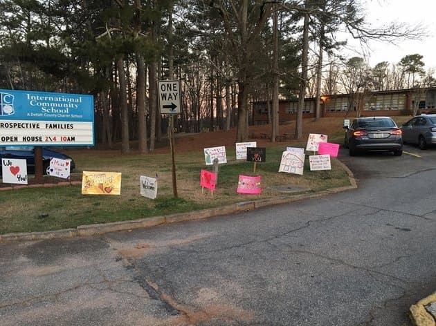 La escuela de la comunidad internacional que enseña a niños refugiados en Georgia se llenó de mensajes positivos en su jardín. Los vecinos decidieron hacer carteles pintados a mano para que los niños realmente se sintieran como en casa, a pesar del miedo que los invadía por la resolución de Trump.