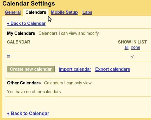 Una vez allí, hacemos otro clic en " Settings" o " Configuración" (arriba, derecha) y luego en la pestaña "Calendarios" de la página con las opciones.