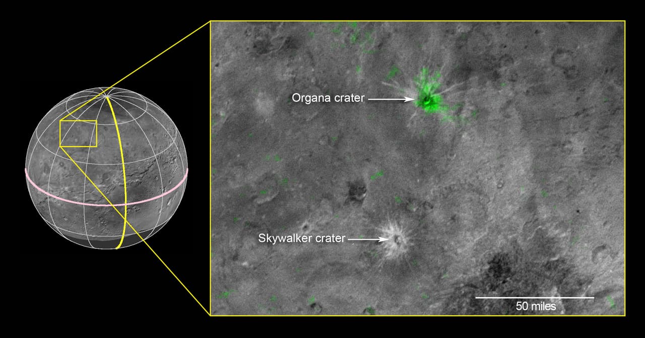 Lo cierto es que Organa y Skywalker son cráteres gemelos, con 5 kilómetros de diámetro y ambos activos. Sin embargo, la región central de la manifestación geológica del primero se muestra eyectando material más oscuro que el segundo.