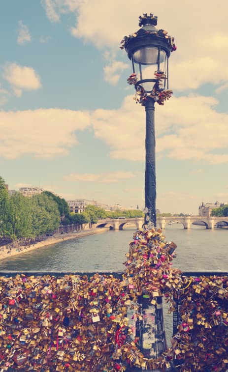 La novela A 3 metros bajo el cielo de Federico Moccia inauguró la costumbre de colgar candados en puentes y verjas como símbolo de amor entre las parejas. El Pont des Arts, el cual atraviesa el río Sena, es uno de los mejores escaparates de esta curiosa tradición en la que los enamorados pueden sellar su amor en un lugar privilegiado. Cada 6 meses el ayuntamiento renueva las verjas del puente lanzando los candados al río, lo cual no sabemos si nos resulta incluso aún más romántico. (Debimos ver Titanic demasiadas veces).