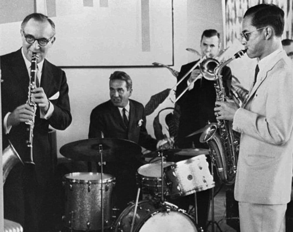 El rey Bhumibol Adulyadej tocando el saxo junto a Benny Goodman en 1960, en Nueva York