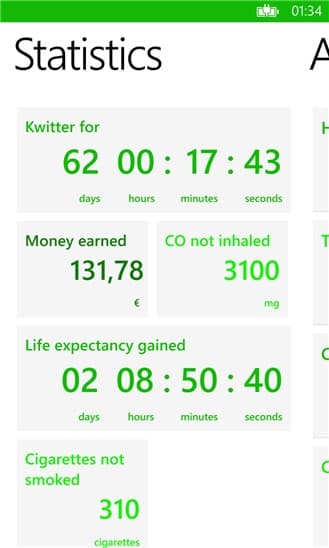 Kwit, también es ideal para compartir tus progresos con tus amigos, ya que puedes compartir tus logros en redes sociales. A medida que vences los retos, verás de forma gráfica cuánto dinero ahorraste e incluso la cantidad de días de vida que se te han añadido gracias al dejar de fumar.