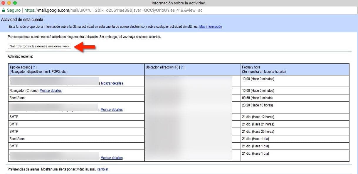 3. Para cerrar todas las sesiones abiertas de Gmail cliquea en «Salir de todas las demás sesiones web».