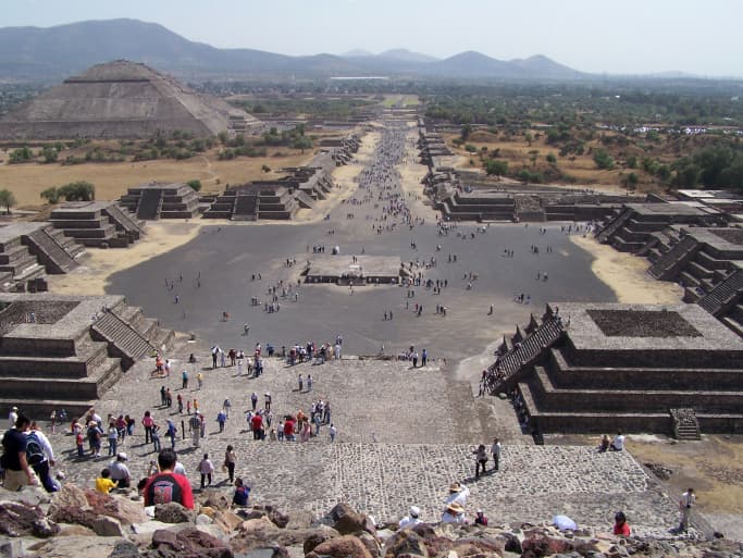 Emplazada en medio de una amplia meseta en el valle de México a 2286 metros sobre el nivel del mar, Teotihuacán abarca 23,5 kilómetros cuadrados, convirtiéndose en uno de los centros de culto más impresionantes de la cultura azteca.
