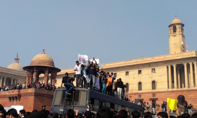(Manifestación estudiantil del 22 de diciembre de 2012 en repudio a la violencia contra la mujer, en Delhi. Estudiantes sobre un autobús policial.)