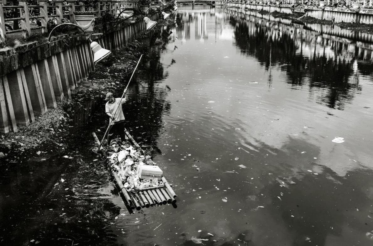 El cambio climático está afectando a Indonesia: hay constantes sequías, seguidas por inundaciones y aumentos del nivel del mar. Por eso, varios hombres como el de la foto, salen a navegar por las aguas crecidas para quitar la basura y evitar una mayor contaminación.