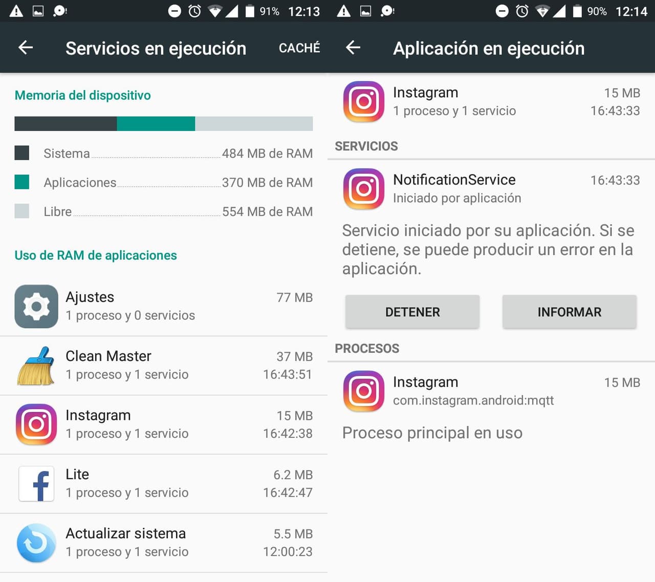 Para liberar espacio, debes ir hasta donde dice «Servicios en ejecución» y una vez dentro de este nuevo panel, donde podrás ver la cantidad de memoria RAM que cada aplicación esta consumiendo, debes identificar cuál es la que está consumiendo más. Luego toca arriba del nombre de la app y selecciona la opción «detener».