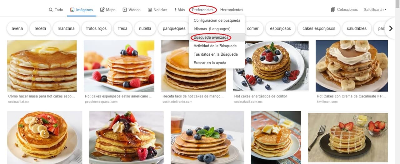 - «Esta palabra o frase exactas»: si la imagen que deseas está relacionada a un conjunto de palabras que siguen un orden definido, deberás escribir la frase entre comillas simples. Por ejemplo: "hot cakes de plátano".