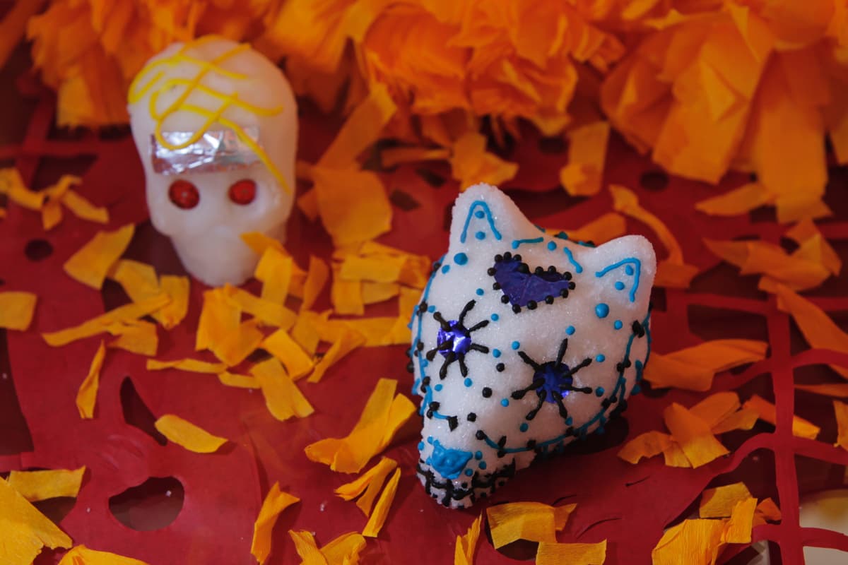 Además de las golosinas de temporada, Garritas Guerreras también fabrica velas con forma de gatos y perros decoradas acorde a la temporada, así como figuras de papel maché que se pueden guardar para próximas ofrendas.