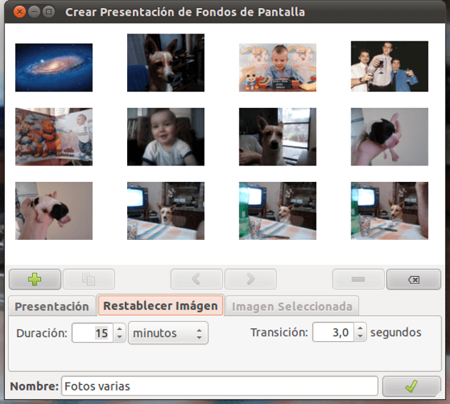 Una vez que nos encontramos en esta pantalla de "Crear Presentación de Fondos de Pantalla" podemos comenzar a seleccionar imágenes. Luego de haber seleccionado una cantidad importante de imágenes podemos elegir la duración del proceso.