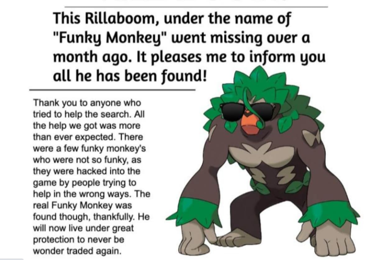 «Antes de darse cuenta de que Funky Monkey faltaba, se preguntaba si era buena idea intercambiar un montón de Pokémon y, por lo tanto, supuso que pudo haberlo intercambiado por accidente, fue entonces cuando comenzamos a poner una imagen similar como esta para que la gente pudiera ayudarnos a encontrarlo» «Mi amigo intercambió una y otra vez para, con suerte, recuperar a Funky Monkey y, después de muchos intercambios y pokemones falsos, mi amigo se sorprendió cuando recibió un Rillaboom y era Funky Monkey»