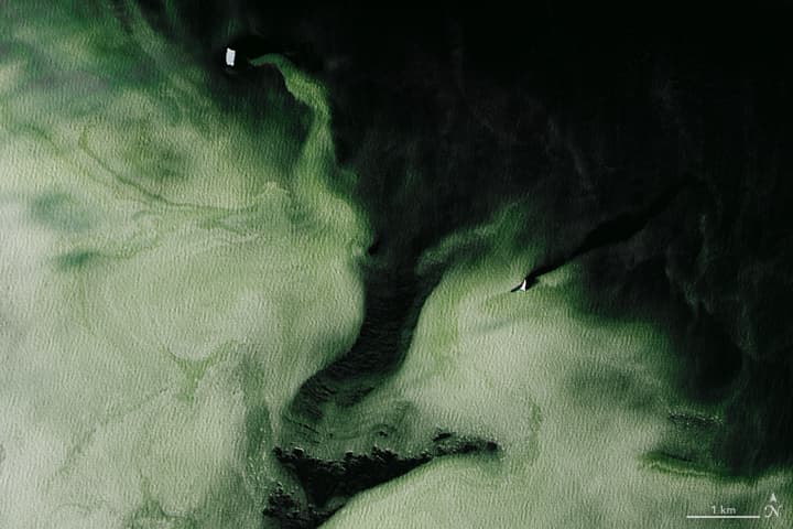 Los observadores de la NASA no están seguros si la masa de fitoplancton y algas se encuentra atrapada en el hielo suave que forma el hielo marino o si está viviendo debajo del hielo marino ya existente.