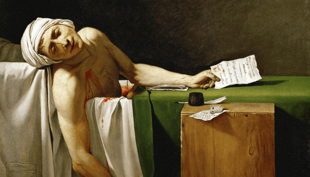 Marat fue un reconocido periodista durante la época de la revolución francesa cuyas críticas radicales le ganaron tantos seguidores como enemigos. Estos últimos, fueron los los responsables de su muerte. Marat padecía de una enfermedad de la piel que lo obligaba a tomar baños a menudo. Esto significaba que gran parte de su vida transcurría en el baño, lo cual también lo ponía en una situación muy vulnerable. El 13 de julio de 1973, una joven mujer llamada Charlotte Corday pidió hablar con Marat bajo el pretexto de tener información de mucha relevancia. El periodista aceptó recibirla en el baño y, tras una conversación de unos 15 minutos, Corday lo asesinó con una letal puñalada en el pecho.