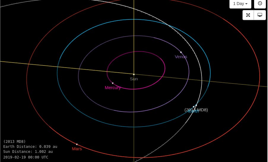 El MD8 2013 estará en su posición más cercana a la esfera celeste a la hora 12:55 ET o 17:55 a la hora de Londres (GMT). Se encontrará a menos de 5 millones de kilómetros aproximadamente, por lo que no hay riesgo de que suceda una colisión, a pesar de que la distancia es realmente corta en términos galácticos.