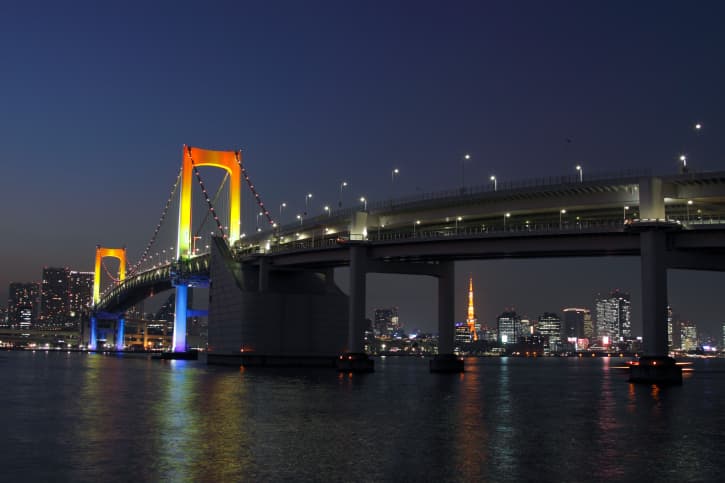 El Puente del Arco Iris, o Rainbow Bridge, es otro espectacular coloso situado en la ciudad de Tokio en Japón. Terminado en 1993, tiene una longitud de 798 metros.