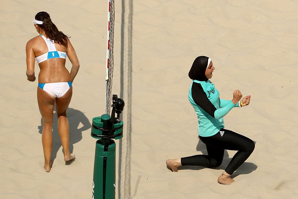 En la imagen aparece, en bikini, la jugadora alemana Kira Walkenhorst, y del otro lado de la red, cubierta por calzas, mangas largas y hiyab, la egipcia Doaa Elghobashy.
