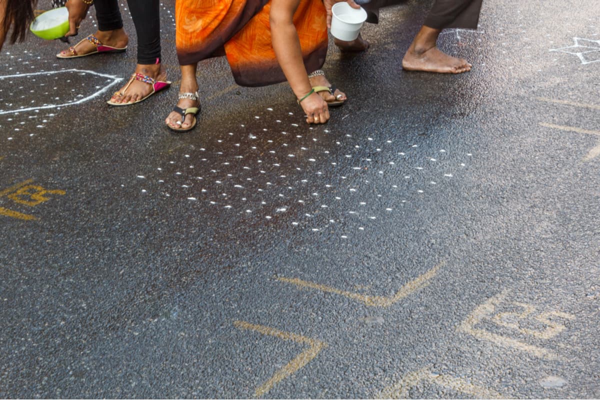 El Kolam es una práctica de dibujo que emplea comúnmente la harina de arroz como su principal material para trazar formas. Las mujeres de las familias que habitan en el sur de la India -en la región de Tamil Nadu- suelen hacerlo todas las mañanas, dibujando una de estas representaciones en la entrada de sus hogares.