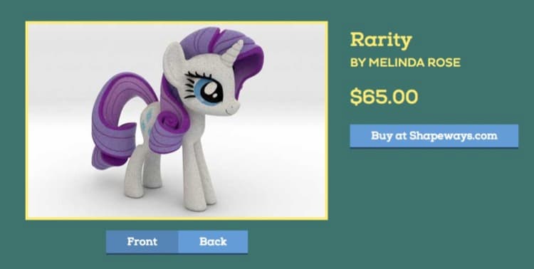 En el caso de My Little Pony, los diseñadores reciben una regalía cuando alguien ordena uno de sus juguetes, pero si eres lo suficiente bueno, perfectamente puedes crear el tuyo y luego mandarlo a imprimir en Shapeways.
