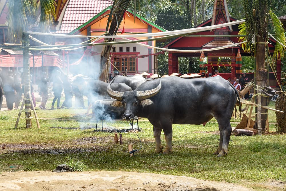 También comen los búfalos, siendo los funerales, una de las pocas oportunidades que tienen los Toraja de comer carne (principalmente comen arroz), razón por la que atraen a miles de personas de distintas partes de la isla.
