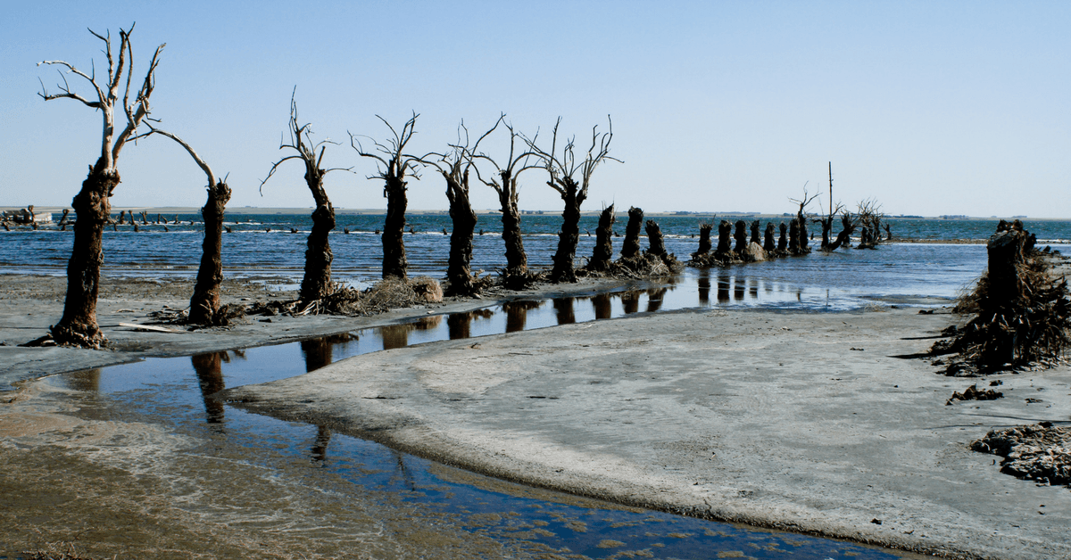 30 años después, el agua comenzó a irse, pero como era extremadamente salada, dejaó a lo que quedaba de la ciudad en ruinas.