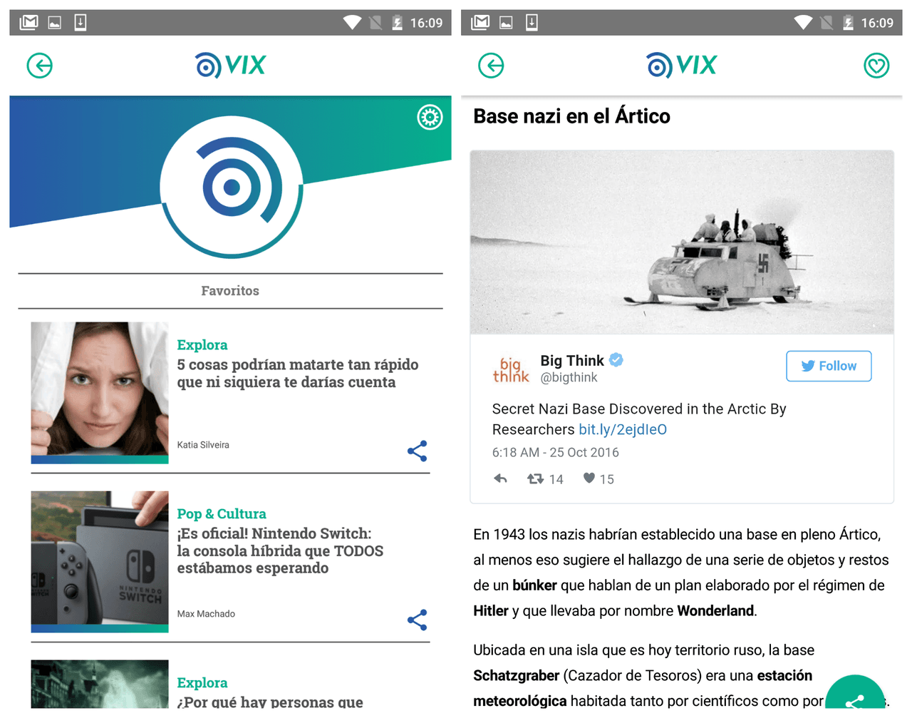 Sencilla, atractiva y accesible, la app de Vix cuenta con un Menú con diferentes canales que puedes visitar e incluso puedes guardar artículos como Favoritos. También cuenta con un buscador para que puedas encontrar el contenido específico que buscas.