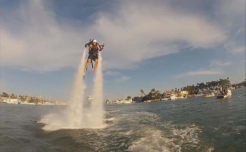 Podéis disfrutar de "volar" en un Jetpack, pero propulsado por agua. Un motor succiona agua y la expulsa a muchísima presión.
