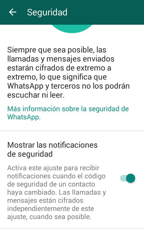 El receptor no se entera de este cambio de cifrado, mientras que el que envió el mensaje solo lo notará si ha marcado antes la opción de “mostrar las notificaciones de seguridad” en Ajustes.