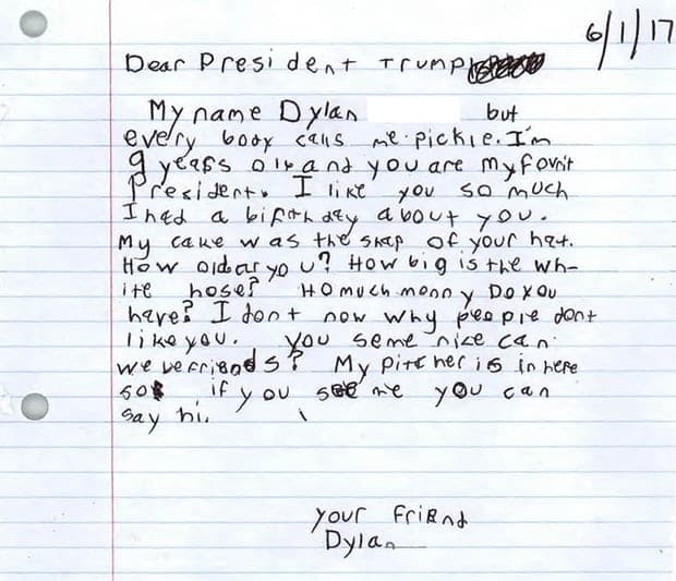 «Me gustaría leer la carta de Dylan de nueve años: "Mi nombre es Dylan Harbin pero todos me dicen Pickle (Pepinillo en español). Tengo nueve años y eres mi presidente favorito. Me gustas tanto que hice un cumpleaños temático sobre ti, mi torta tenía la forma de tu sombrero.
