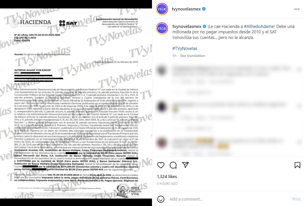 La publicación tuvo acceso al documento oficial, que fue emitido el pasado 23 de febrero, en donde se especifica que el actor debe 3.4 millones de pesos (178,949 dólares) al fisco desde 2017. Sin embargo, la cifra ascendió a los 9.8 millones de pesos (515,794 dólares), debido a los recargos por retraso.