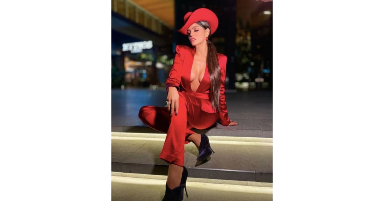Ana Bárbara presumió su figura con un escote hasta el ombligo en un traje sastre satinado