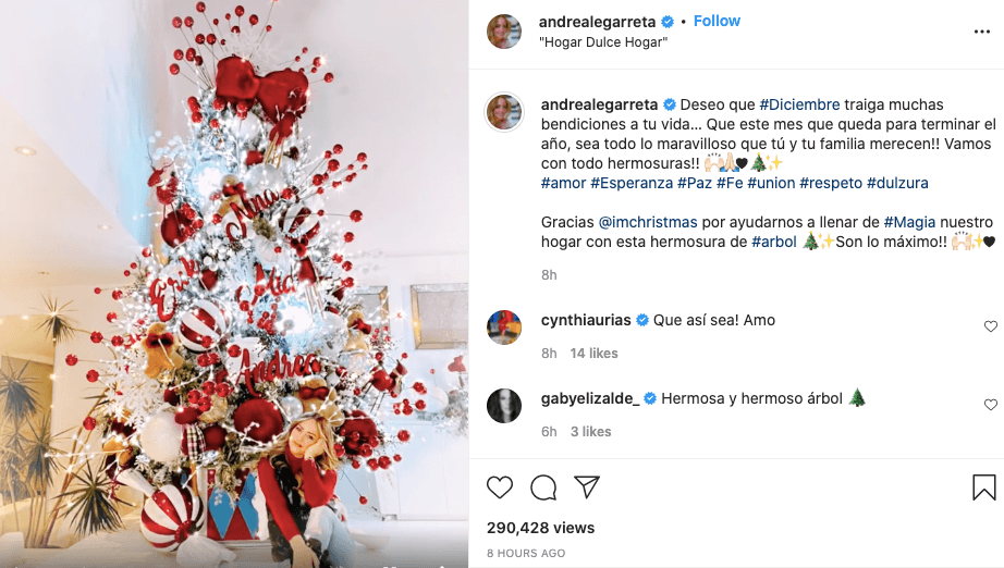 Unos días más tarde, el 29 de noviembre, publicó una imagen presumiendo el árbol navideño que la compañía IM Christmas colocó en el foro del programa Hoy, el cual está lleno de esferas gigantes rojas y blancas, ramas y bastones enormes. Es tan grande que en la foto se puede ver que Andrea le llega a la mitad, aún cuando está usando tacones.