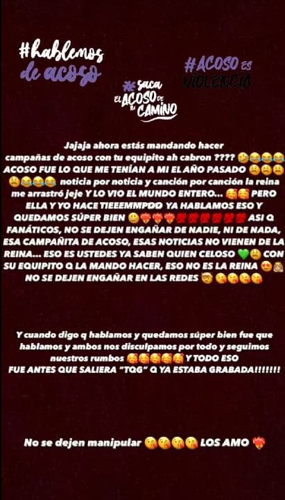 "Acoso fue lo que me tenían a mí el año pasado. Noticia por noticia, y canción por canción, la reina me arrastró je, je, y lo vio el mundo entero…", agregó.