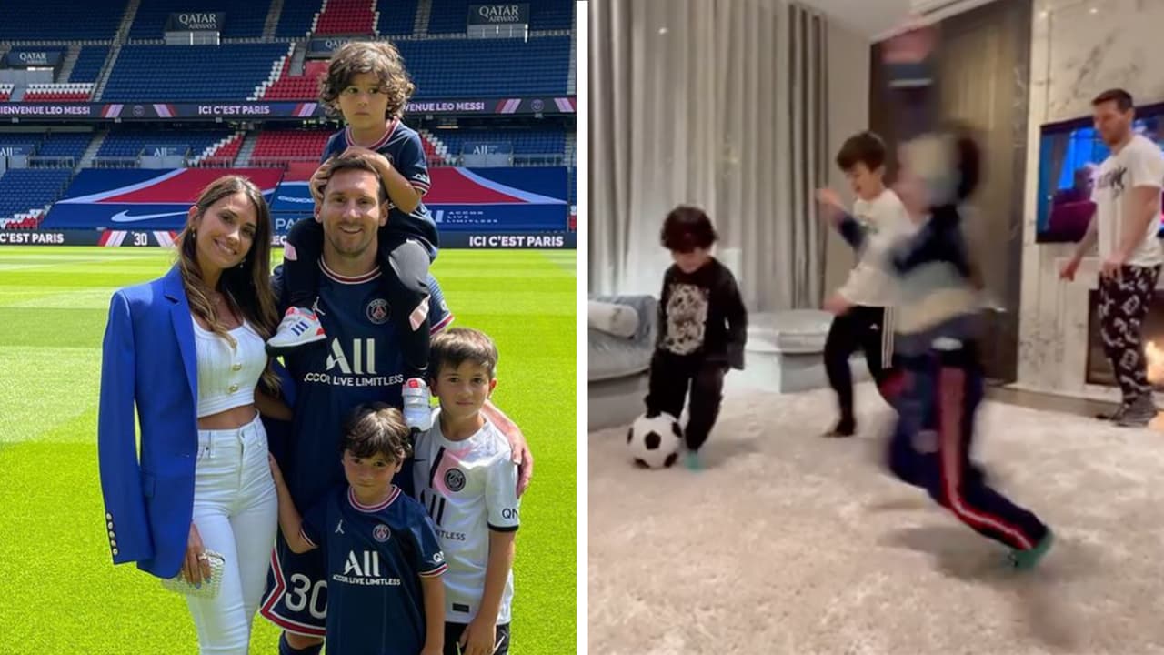 Messi jugó una cascarita familiar en la sala de su casa con sus tres hijos, Ciro, Thiago y Mateo.