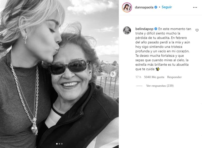 A través de las redes sociales, Danna Paola escribió un mensaje de despedida para su ser querido y en los comentarios se leen las palabras de Belinda: “En este momento tan triste y difícil siento mucho la pérdida de tu abuelita”.