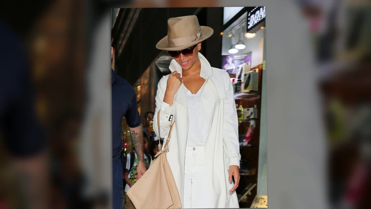 La estrella usó unos jeans ajustados blancos, una camiseta blanca, y un gabán blanco