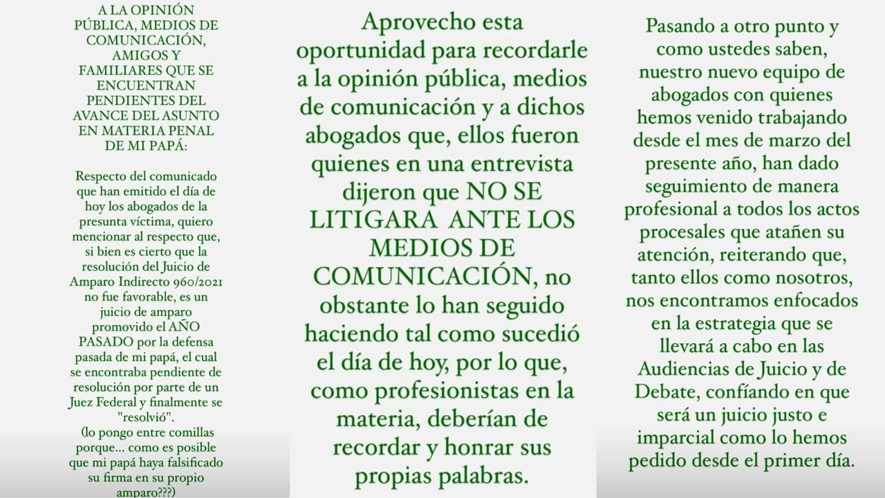 Tras la publicación del despacho de abogados de Alexa y Ginny Hoffman, la joven reaccionó a través de sus historias de Instagram, aseguró que el amparo que fue negado fue una estrategia de la defensa de su padre hasta marzo pasado y del cual solo se esperaba la resolución.