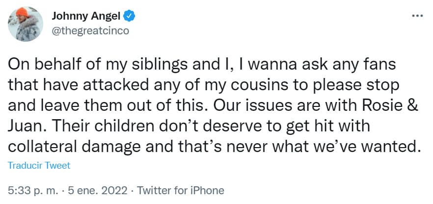 "En nombre mío y de mis hermanos quiero pedirles a los fans que hayan atacado a alguno de mis primos que se detenga y los dejen fuera de esto. Nuestros problemas son con Rosie y Juan. Sus hijos no merecen ser golpeados con daños colaterales y eso nunca es lo que hemos querido", escribió en un primer tuit.