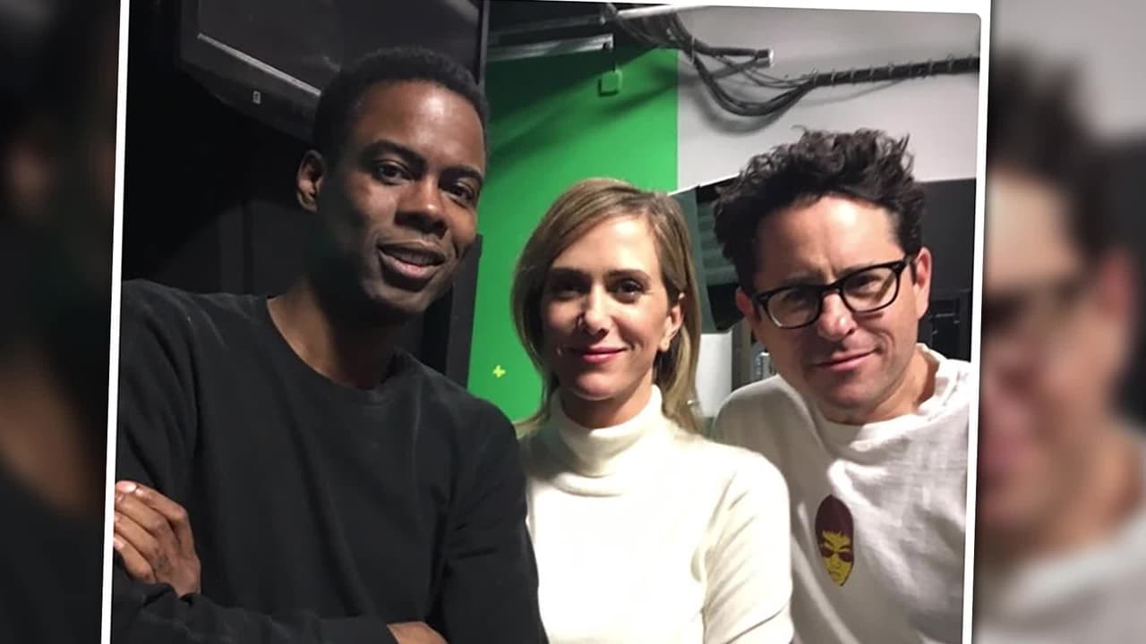 Chris bromea con su rol como presentador usando un traje espacial y posando con Kristen Wiig y J.J. Abrams.