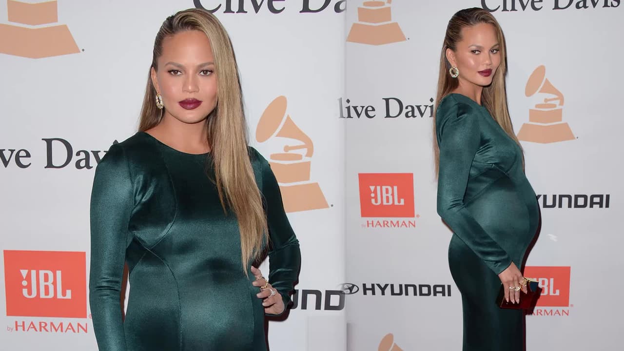 Chrissy Teigen muestra su barriga de embarazo con vestido ajustado