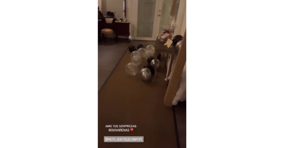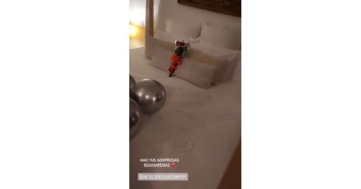 En esta ocasión la sorprendió con un detalle muy tierno el hotel en el que se están hospedando, pues decoró la habitación con globos plateados y color negro, velas, un ramo de rosas sobre la cama, un par de regalos y una tarjeta que dice: