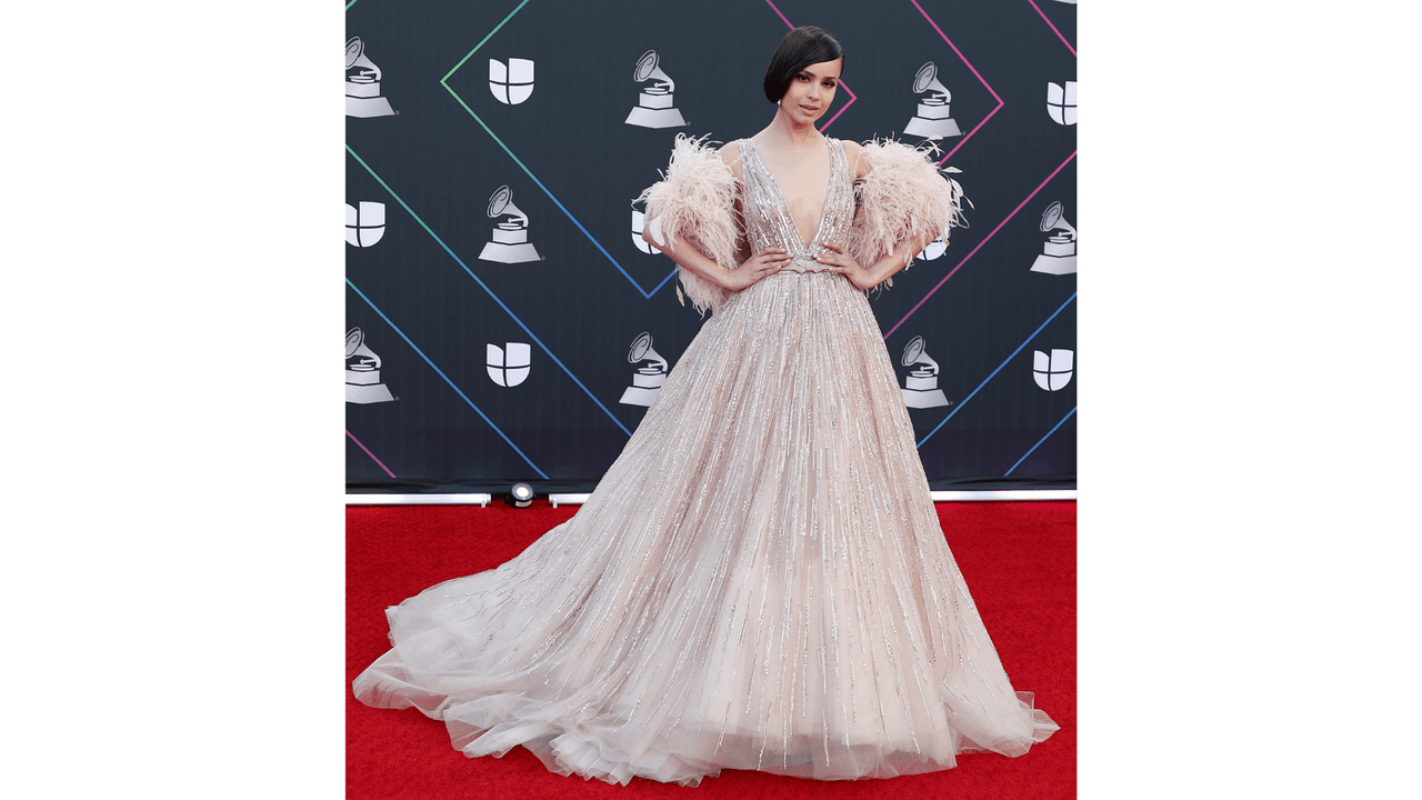 Para la entrega de los Latin GRAMMY el pasado 18 de noviembre, la actriz apareció en la alfombra roja luciendo un vestido palo de rosa con varias capas de tul, con bordados metálicos y un cinto que marcaba su figura, en cuanto a los accesorios únicamente llevó un anillo acompañado de pequeños aretes. El maquillaje que eligió fue en tonos ‘nude’ y rosas.