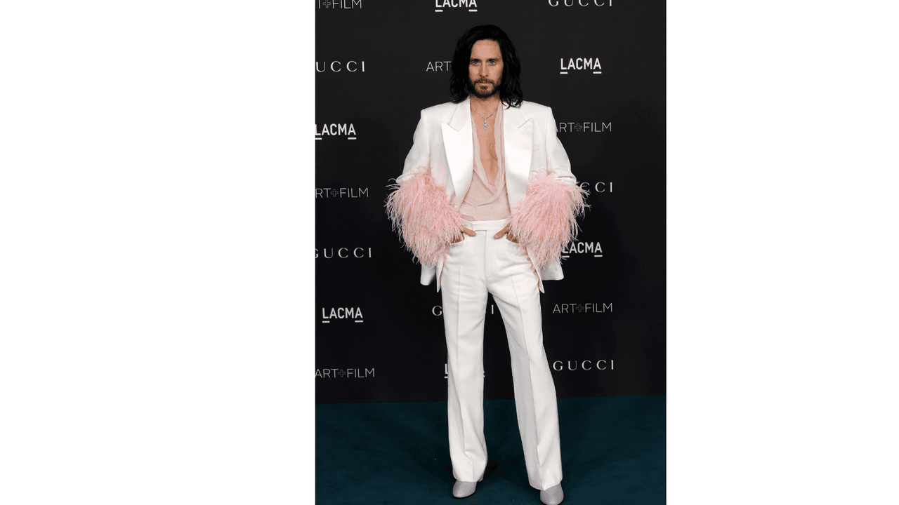 El actor apareció en la premiere de la cinta ‘House of Gucci’ en Los Ángeles el 19 de noviembre de 2021. El también cantante utilizó un traje blanco de dos piezas, con pantalones de corte recto y grandes solapas en el saco. El complemento perfecto de su outfit fueron las plumas de color rosa bebé sobre las mangas, las cuales no eran exageradas.