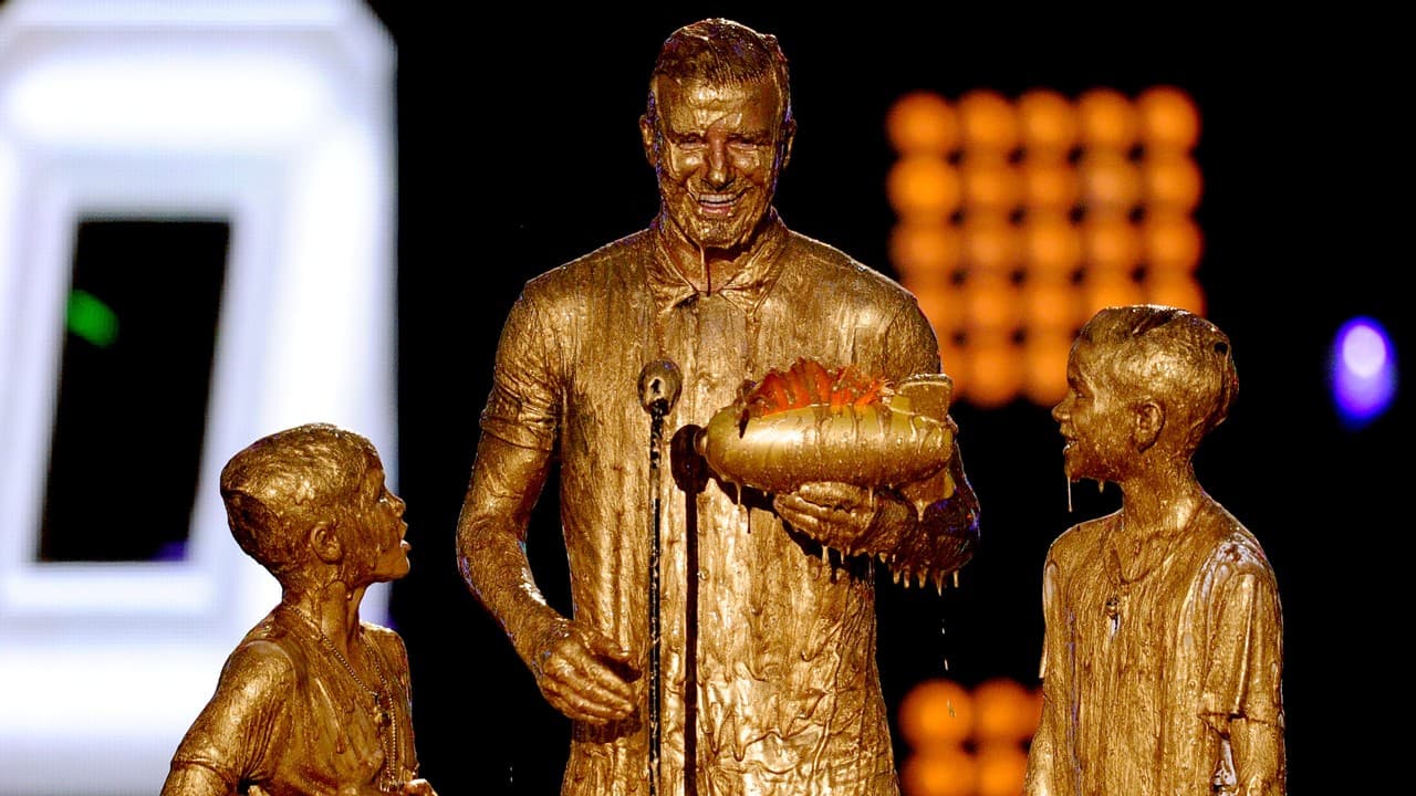 El talentoso ex futbolista fue premiado en los Premios Nickelodeon Kids' Choice Sport en homenaje a su gran carrera deportiva y fue bañado junto a sus hijos en una sustancia dorada que los lavó por completo.