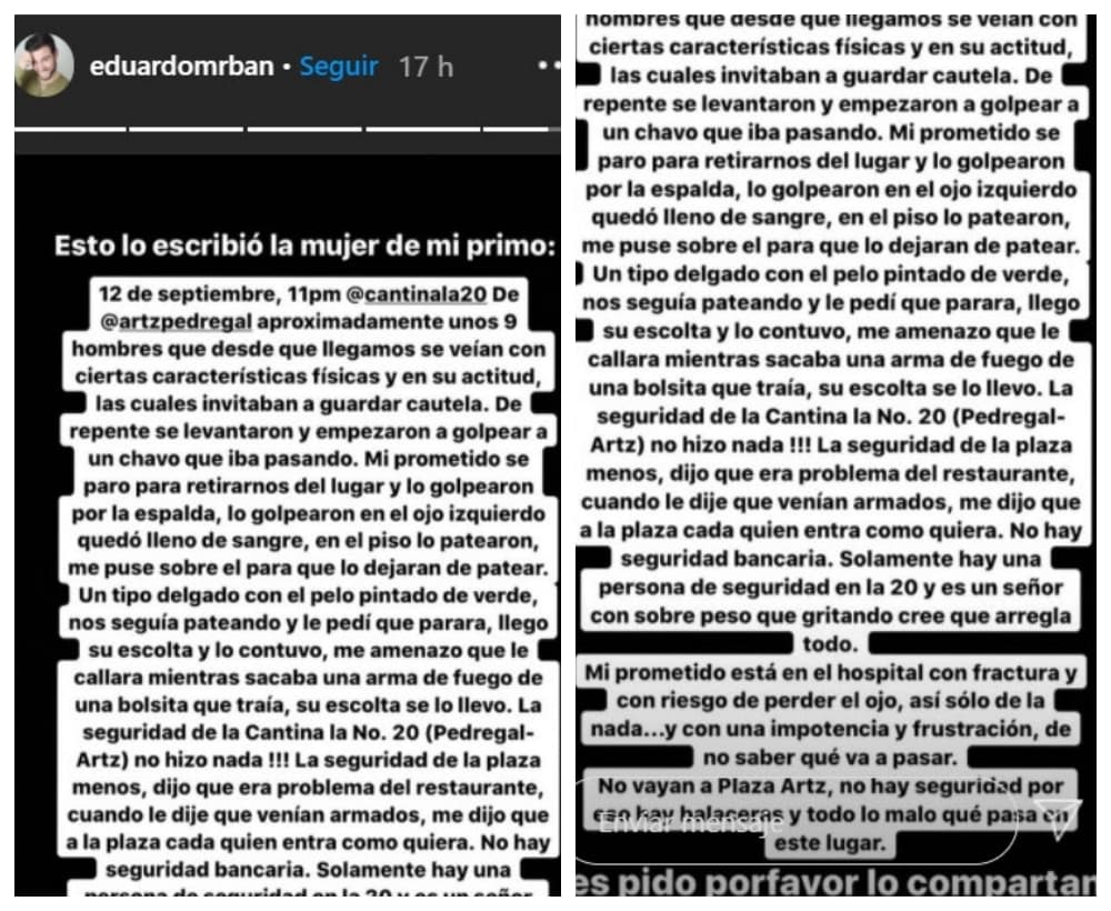 Eduardo Capetillo Gaytán y Eduardo Marban reportaron que su primo fue golpeado violentamente en una cantina de la Ciudad de México el pasado 12 de septiembre. Los jóvenes expresaron su indignación y pidieron ayuda para dar con los responsables.